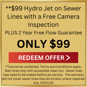 **$99 Hydro Jet on Sewer Lines with a Free Camera Inspection PLUS 2 Year Free Flow Guarantee |